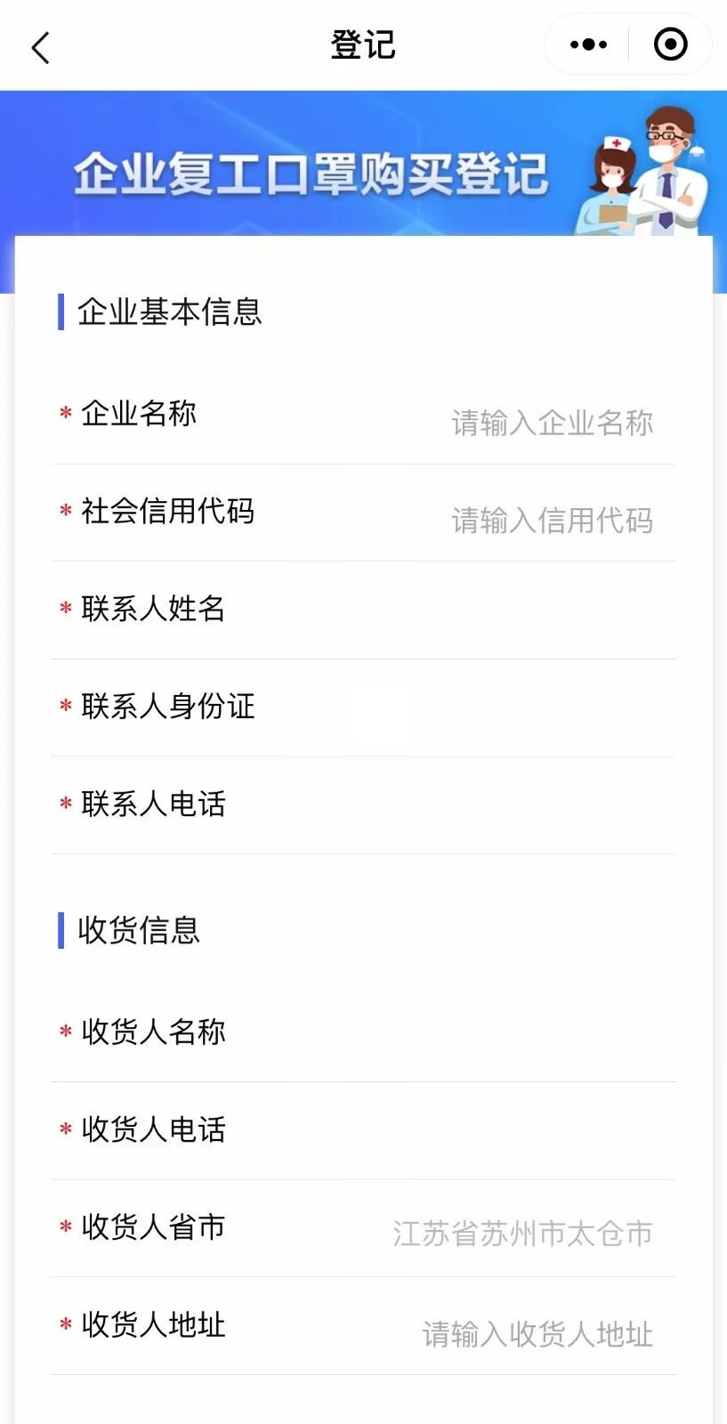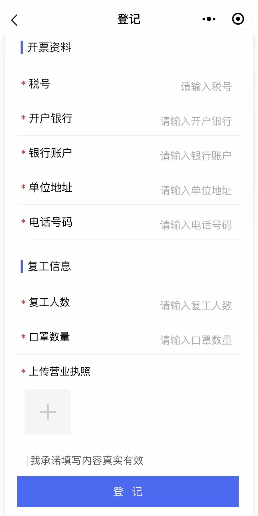 填写企业名称、社会信用代码、联系人信息、复工人数、购买数量、开票信息、收货信息等,上传企业营业执照正本照片。