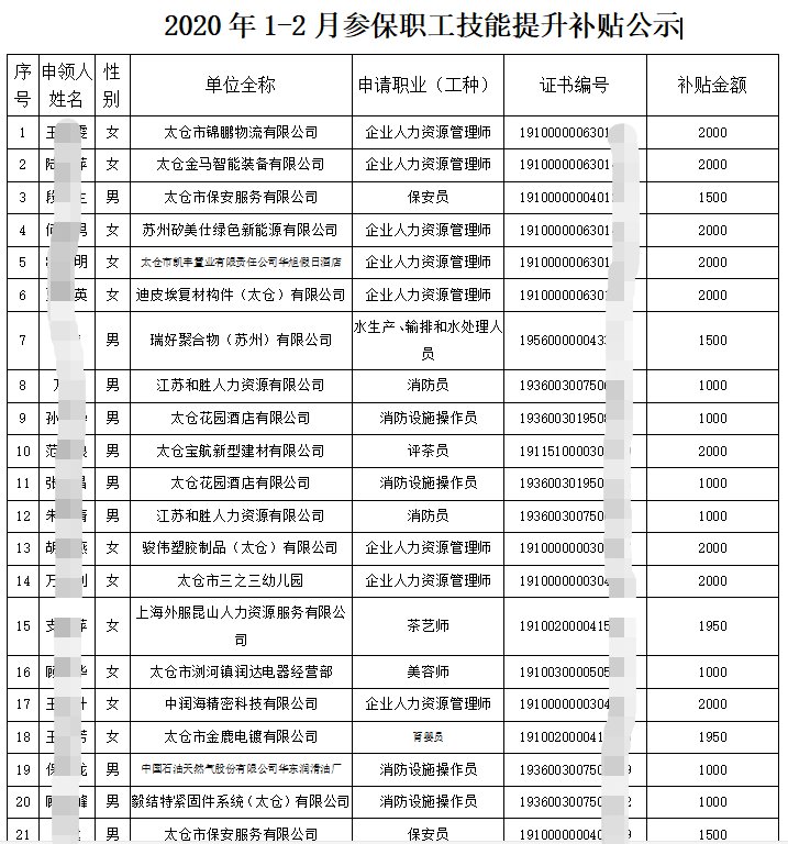 太仓参保职工职业技能补贴公示表(太仓社保补贴)