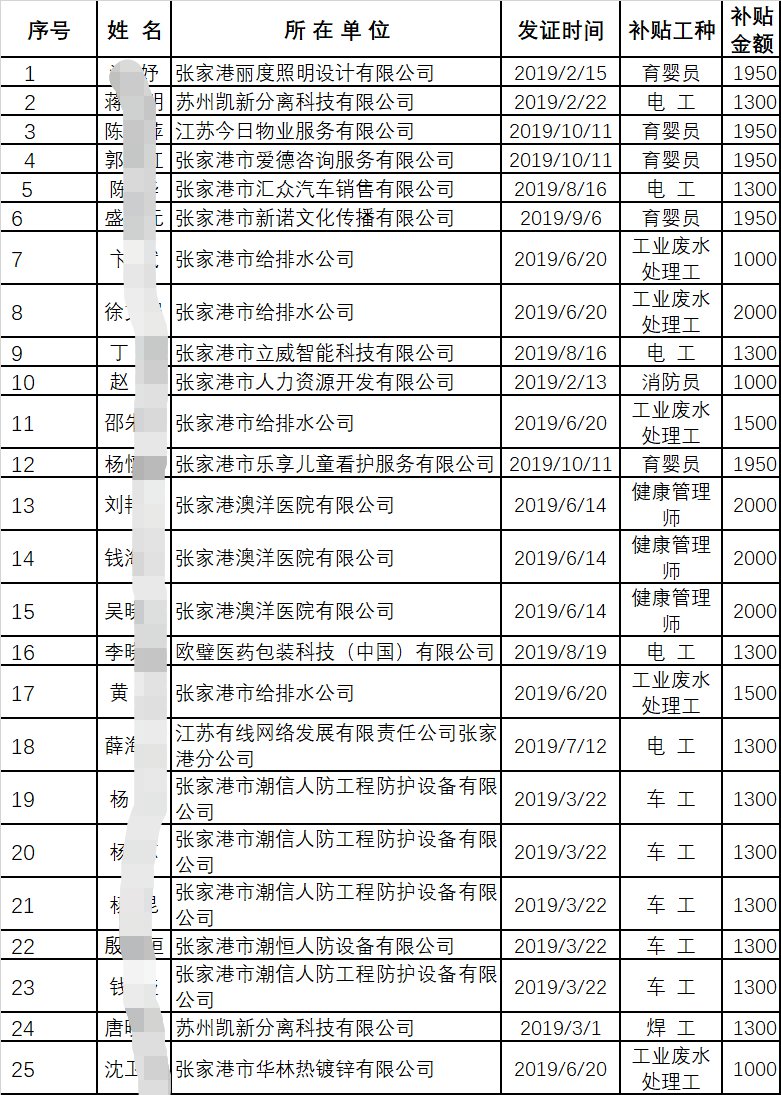 张家港市失业保险支持参保职工提升职业技能补贴发放公示(每月更新)