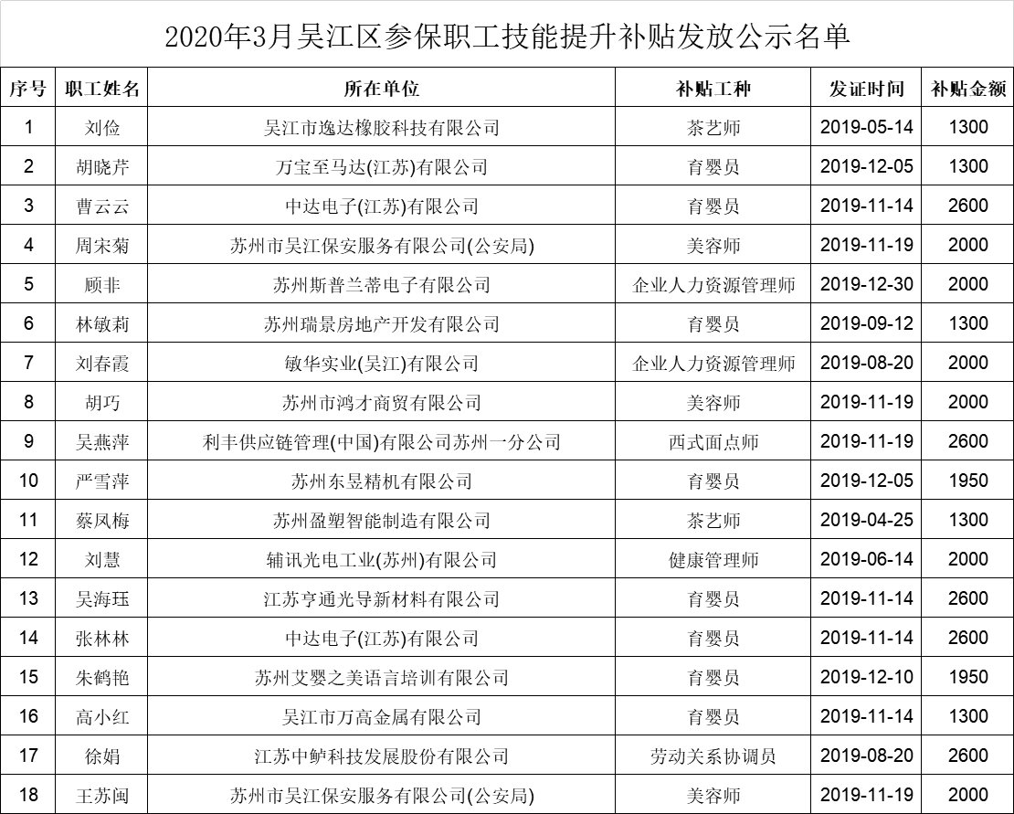 根据《关于做好失业保险支持参保职工提升技能补贴申领工作的通知》(吴人社就(2018) 11号)相关规定,现对2020年3月申请符合技能提升补贴发放条件的18名参保职工相关情况进行公示,接受社会监督。