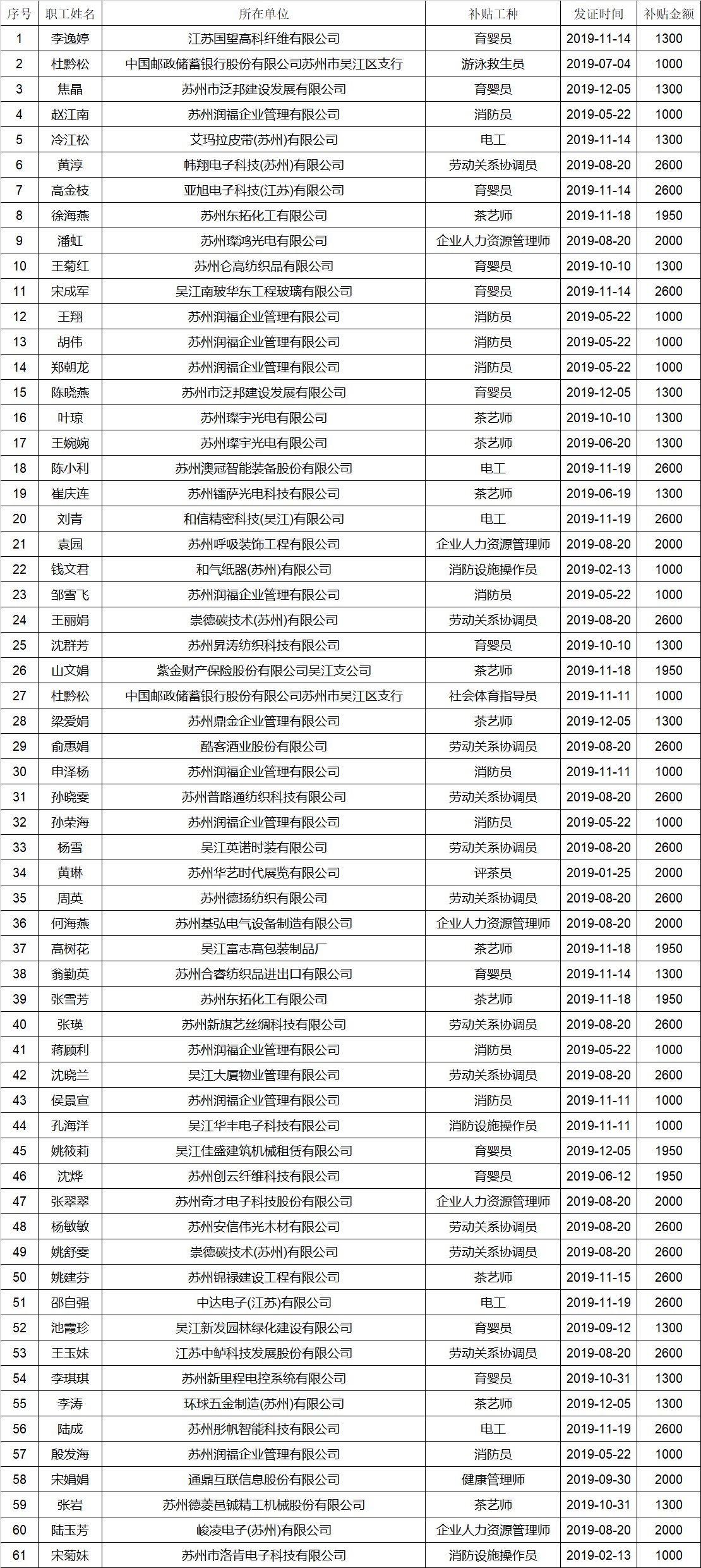苏州吴江参保职工技能提升补贴发放名单(持续更新)