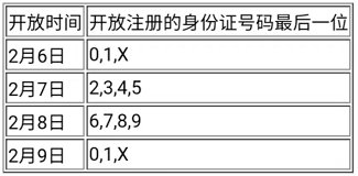 例如:市民身份证号码为3205********001X,可在2月6日和9日7:30-1 9:00进行新用户注册。
