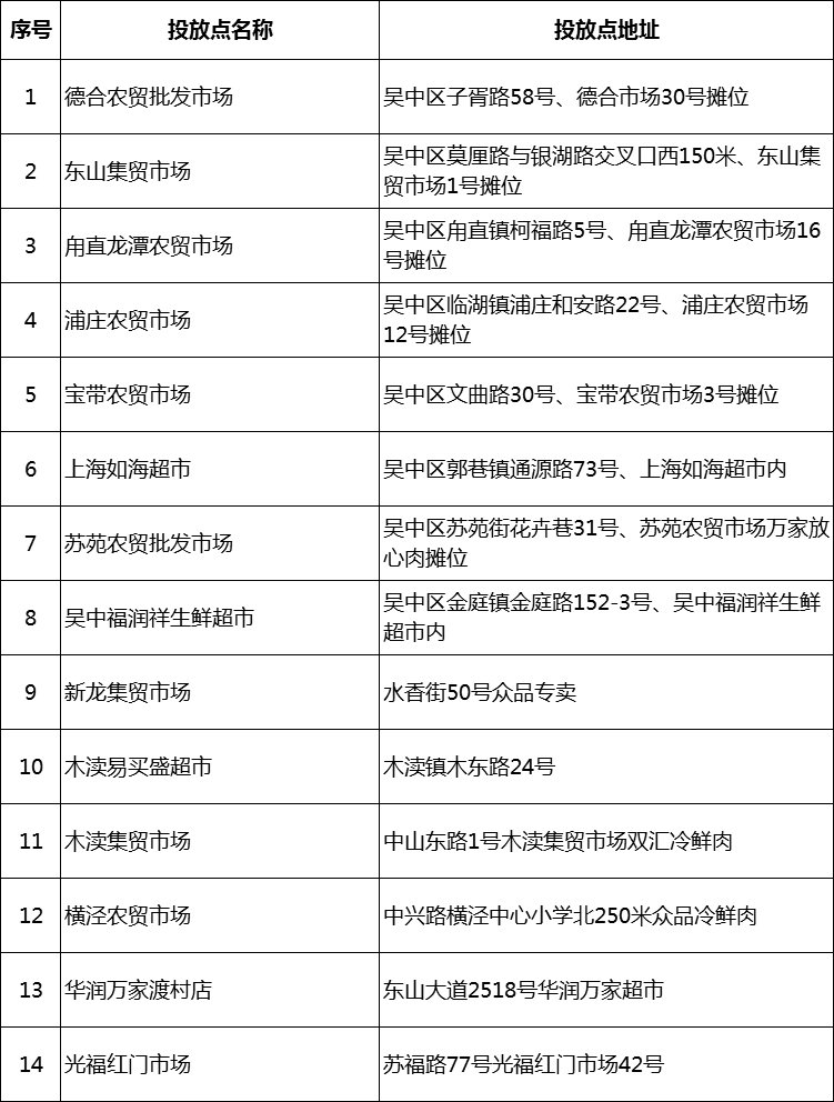 投放选取德合农贸批发市场等14个投放点组织投放。投放期间,居民可到摆放“吴中区政府储备猪肉销售点” 标识牌的投放点购买。