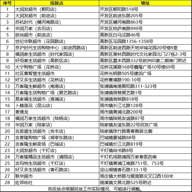 3、本次投放选取大润发超市(朝阳店)等28个投放点组织投放。投放期间,居民可到摆放“市政府储备猪肉销售点” 标识牌的投放点购买。