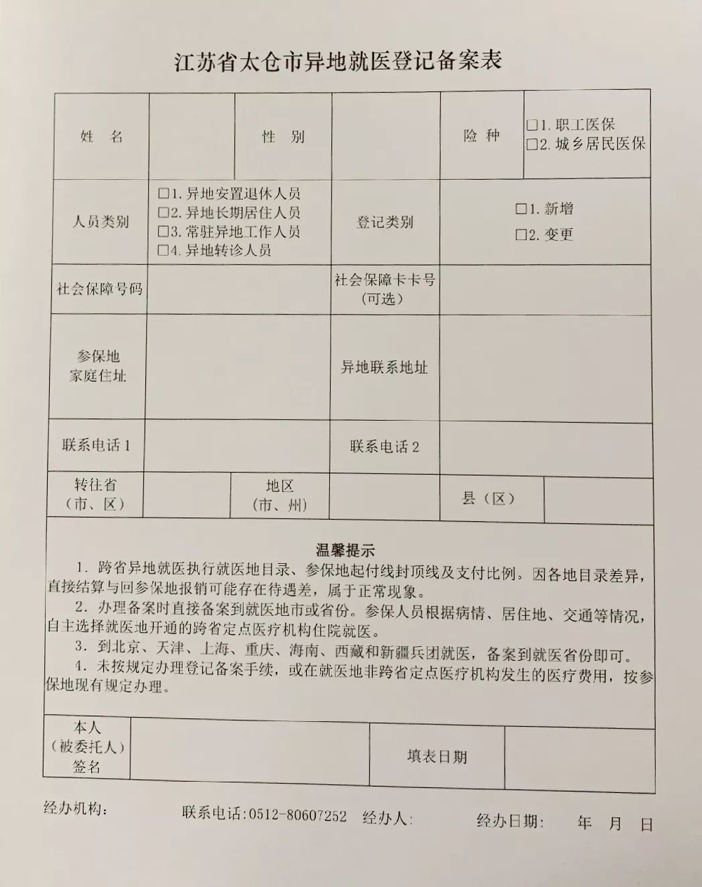 ①登记备案:异地居住人员持社会保障卡,填写《异地就医登记备案表》至经办机构或通过传真办理备案手续。