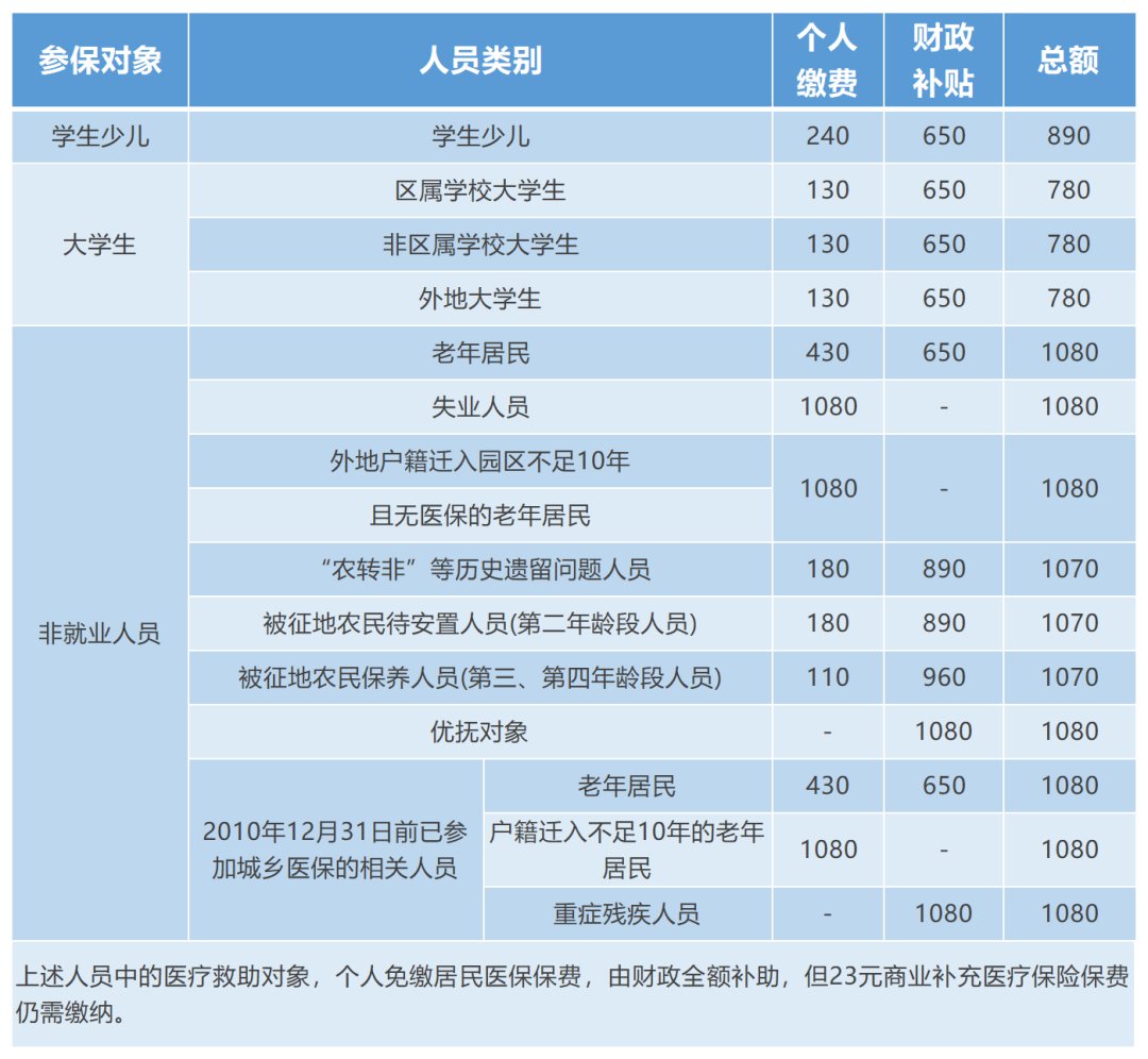 2021年度居民医保的缴费标准详见下表,另按园区管委会《关于园区商业补充医疗保险实施意见(试行)》的规定,商业补充医疗保险的保费同步收缴,缴费标准为每人23元。