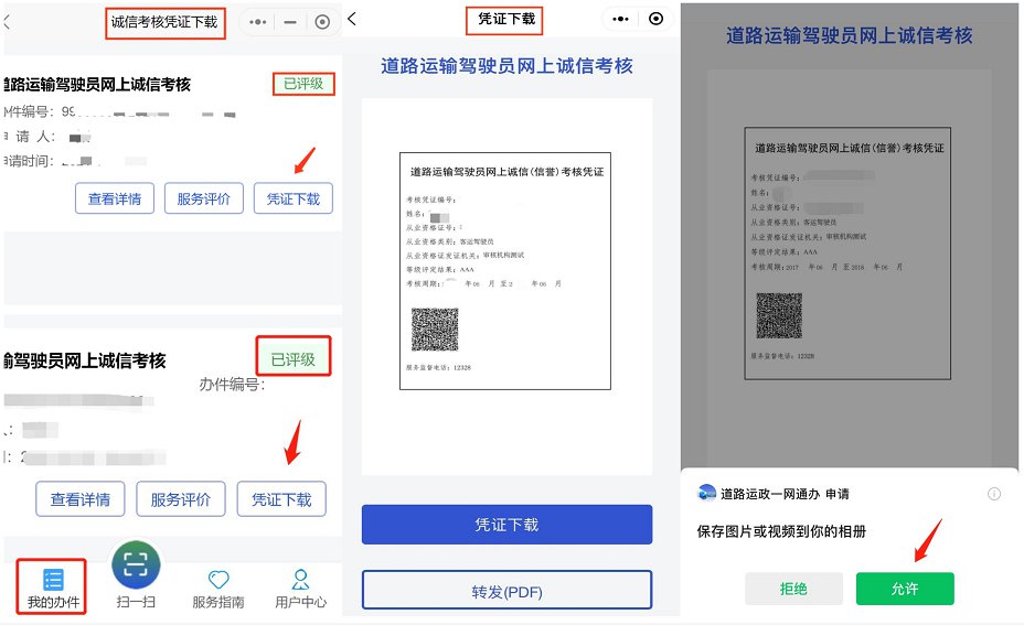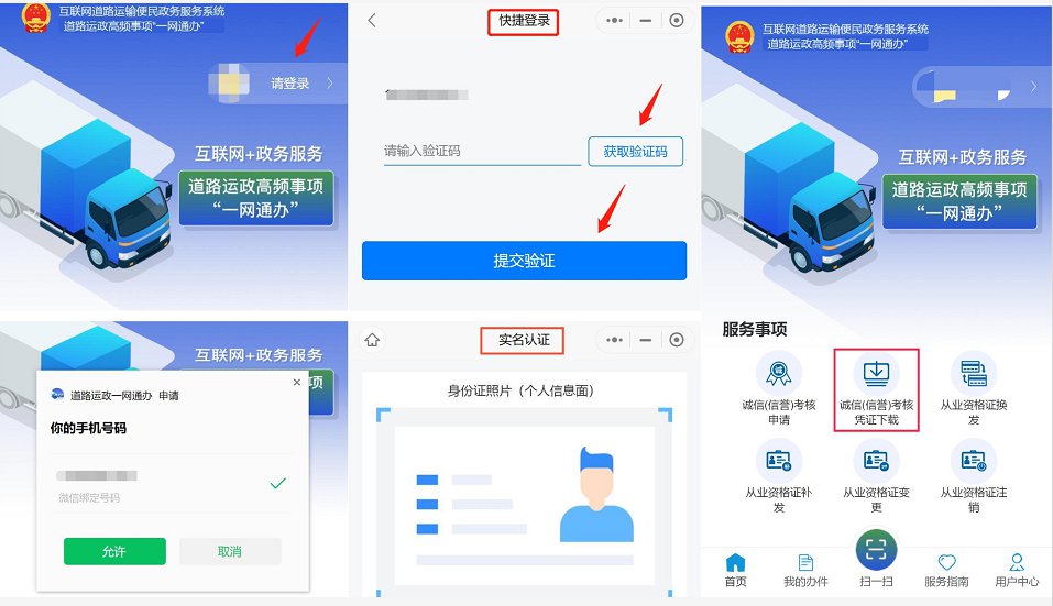 登录"道路运政一网通办“小程序后,点击【服务事项】→【诚信(信誉)考核凭证下载】,进入诚信考核凭证下载。可下载诚信考核业务审核通过已评级的凭证。