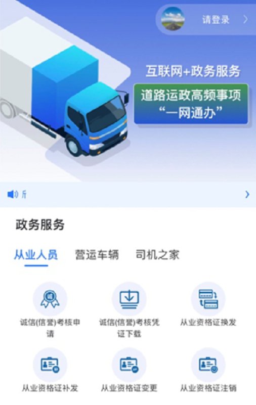 1、微信搜索小程序“道路运政一网通办”,点击右上角“登录”。