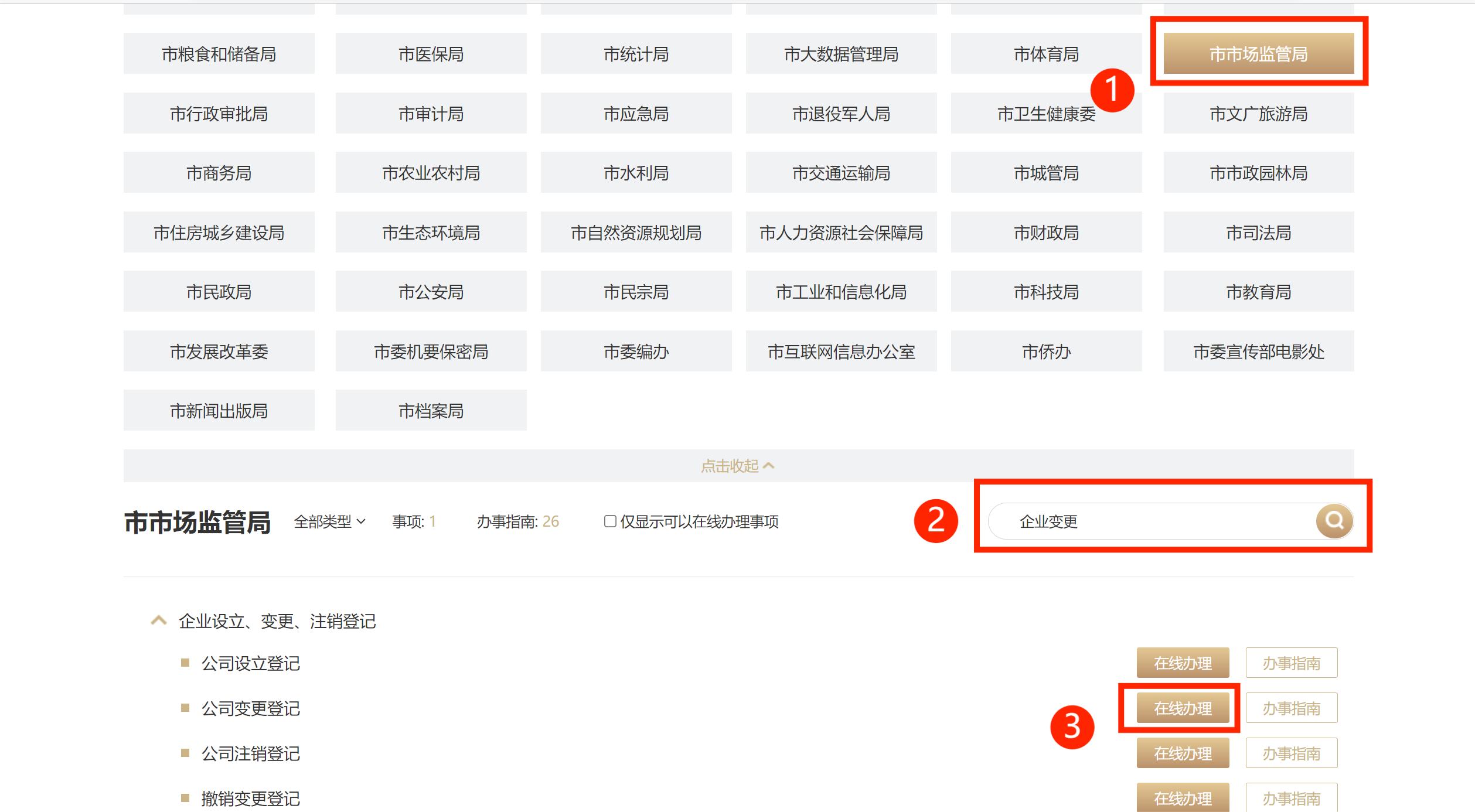 2. 选择“市市场监管局”,搜索框内输入“企业变更”,点击搜索,再点击公司变更登记后面的“在线办理”;