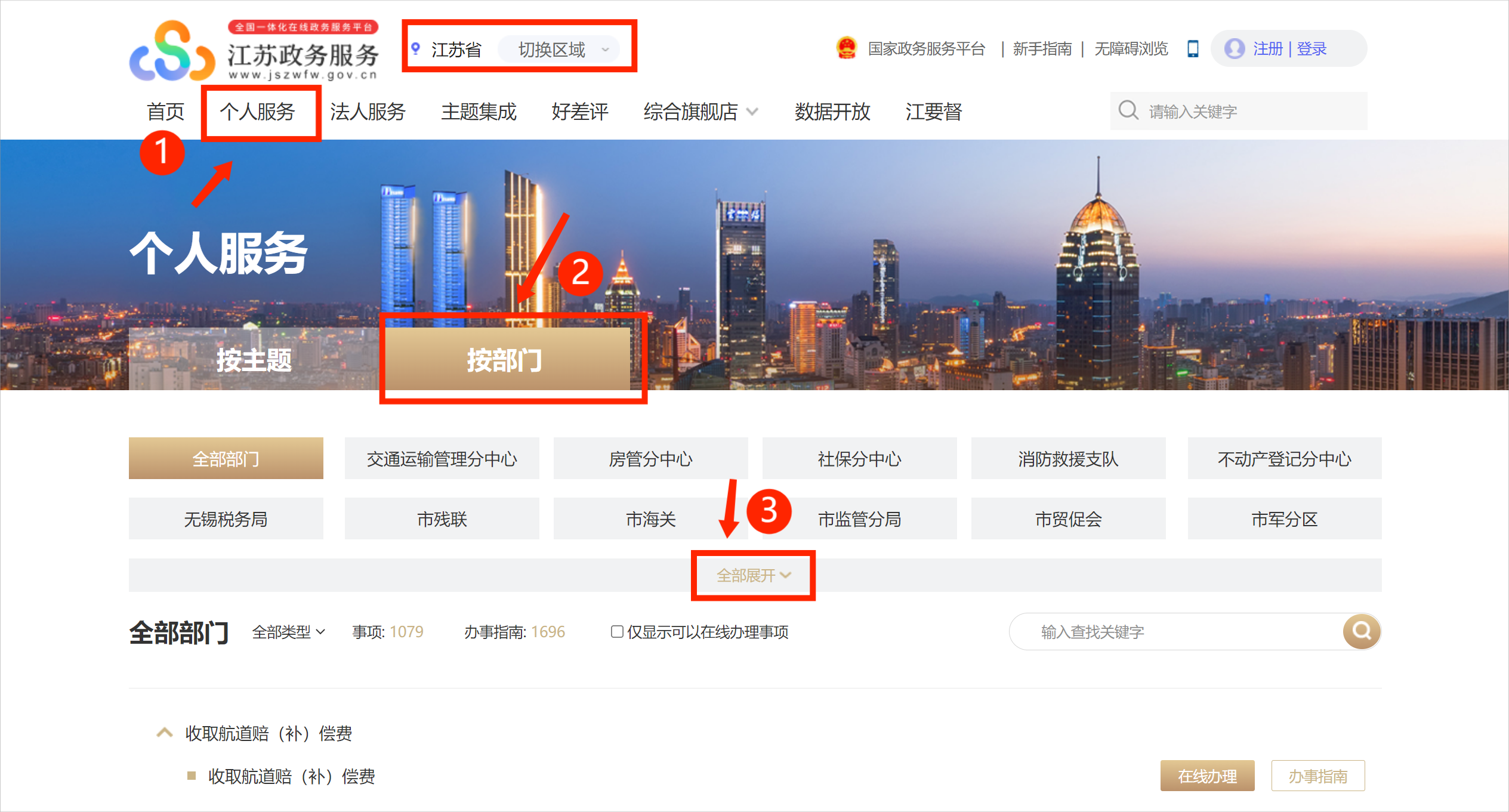 1. 进入江苏政务服务网,点击切换区域,选择无锡市,再点击个人服务——按部门——全部展开;
