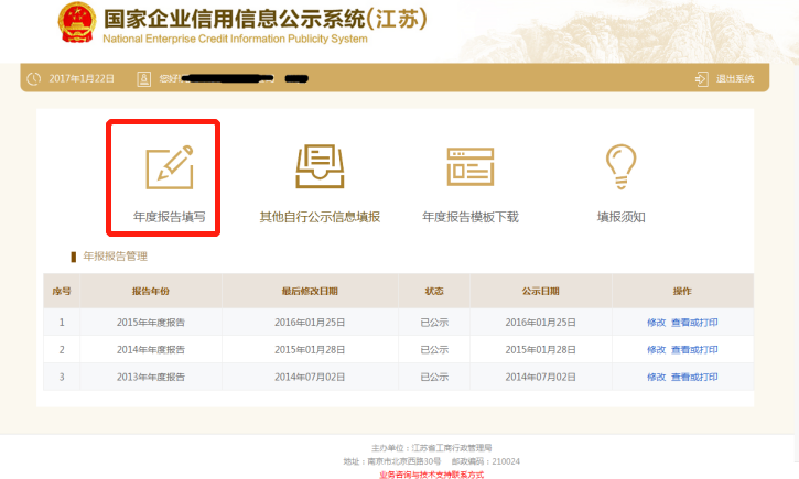 4.登录成功后,进入如下所示主页面。可看见四大主菜单,和历年的年报信息。点击“年度报告填写”开始年报。