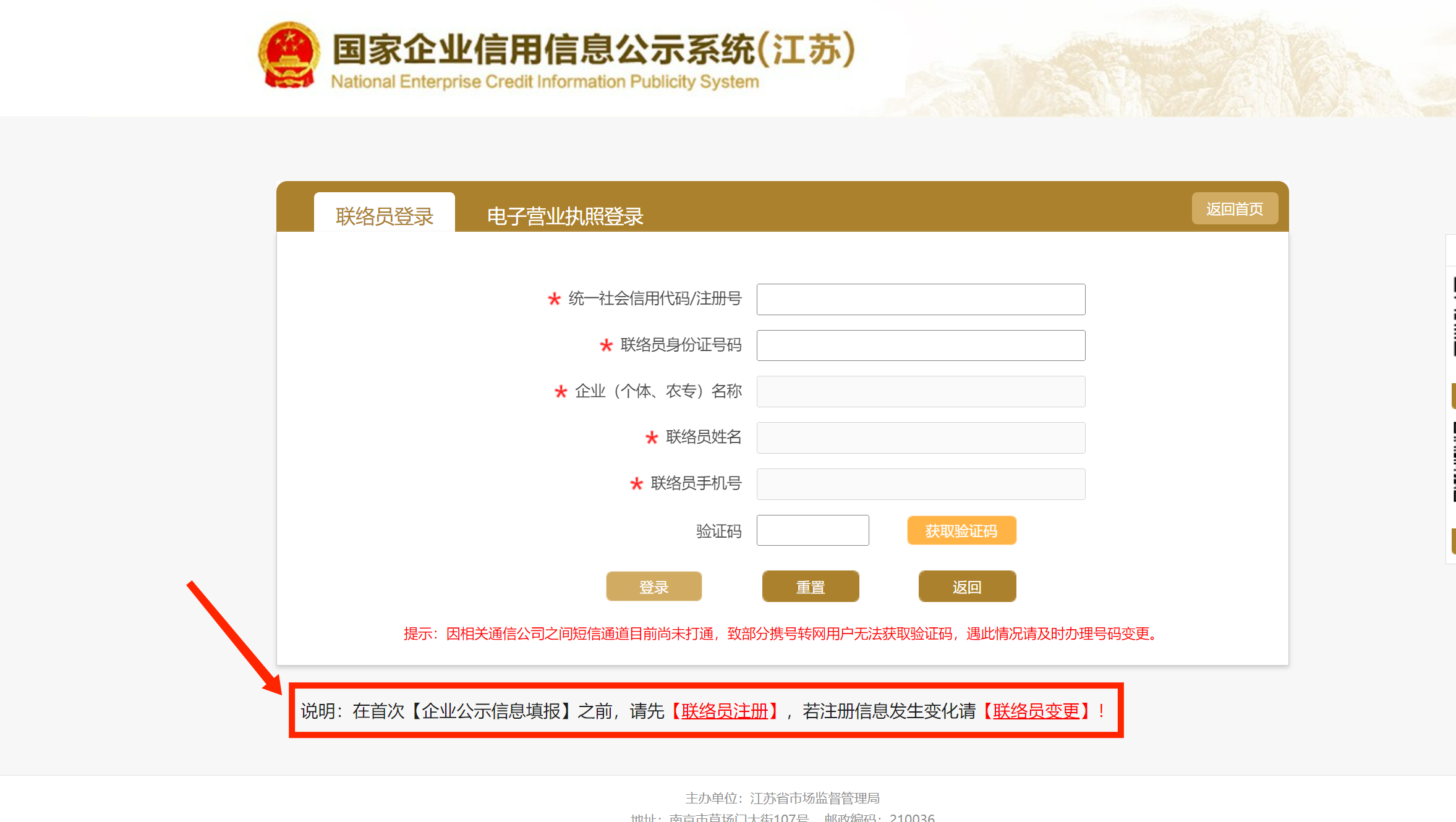 3. 首次填报先点击下方的“联络员注册”,然后填写相关信息注册登录,进入年报填写页面;