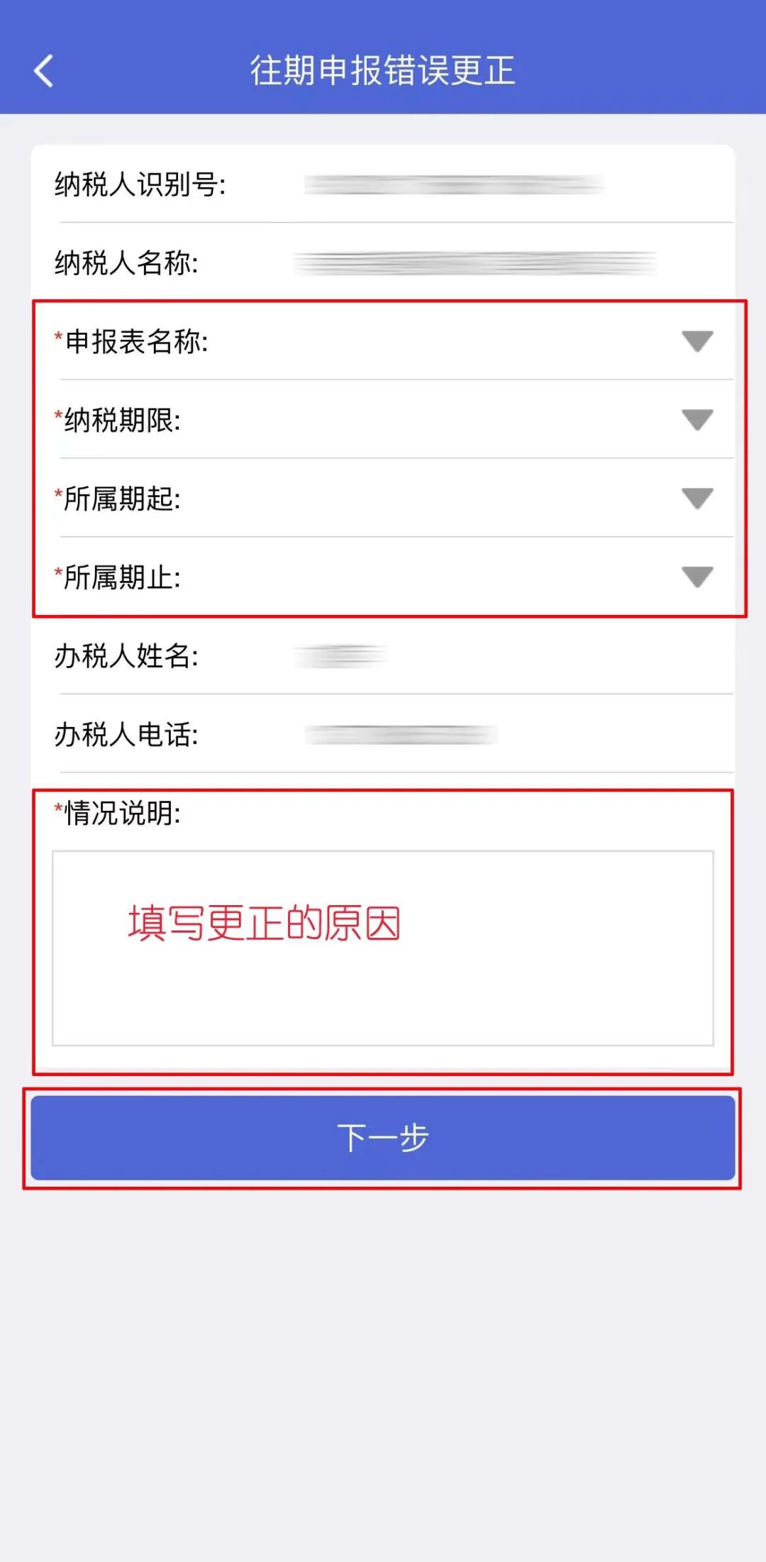 依次选择“申报表名称”、“纳税期限”、“所属期起”、“所属期止”,填写“情况说明”,点击【下一步】。