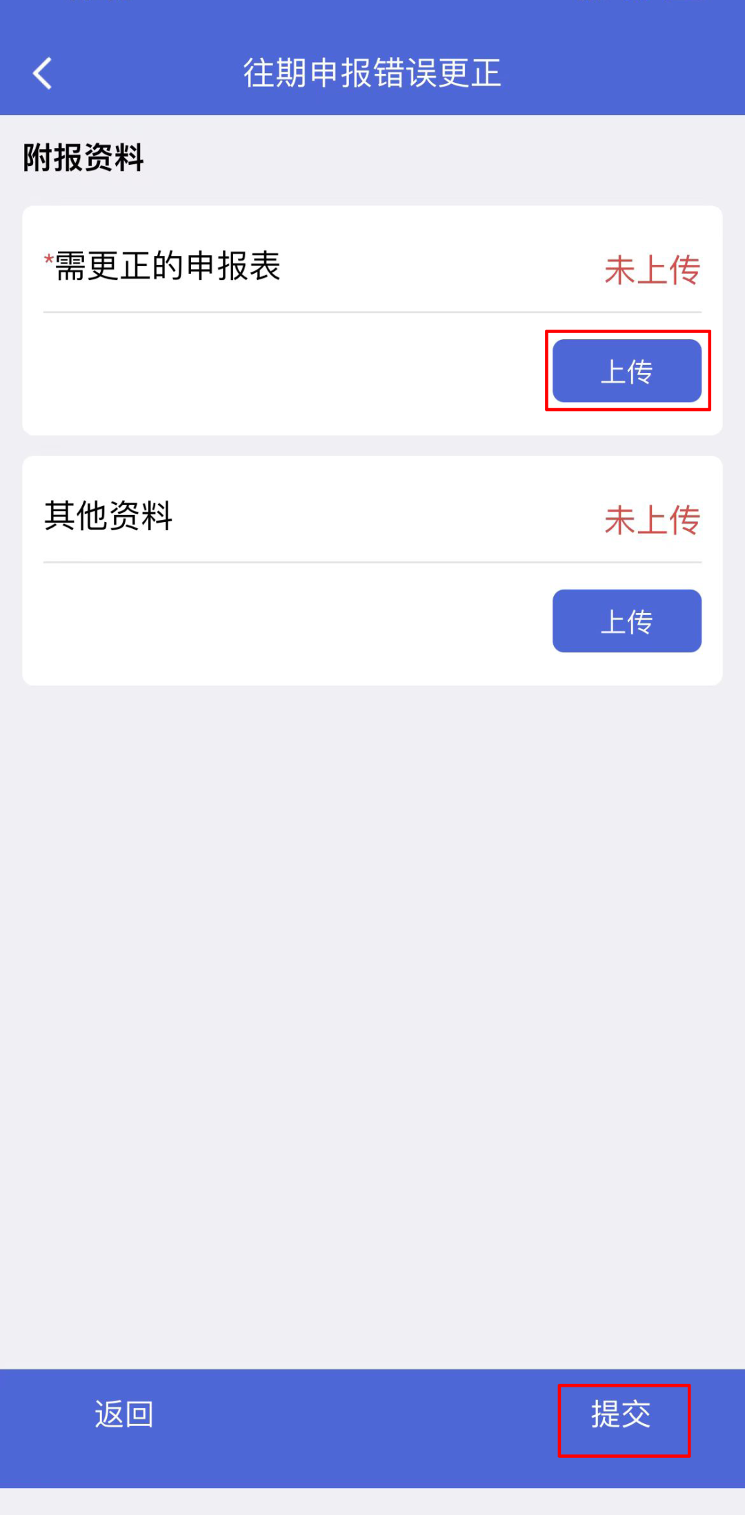 点击【上传】“需更正的申报表”(建议PDF格式,5Mb以下)→【提交】。