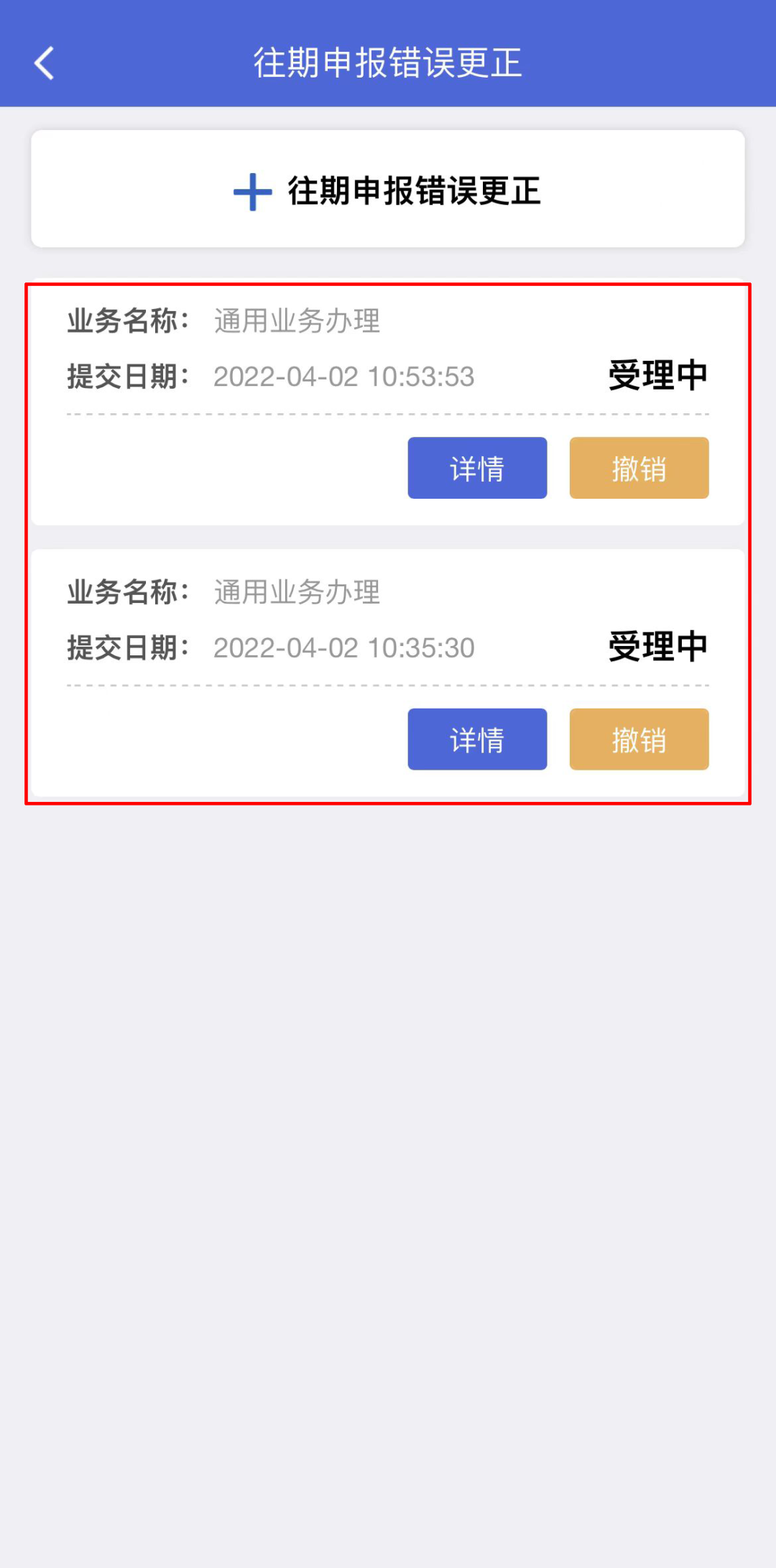 通过【办税】→【申报纳税】→【往期申报错误更正】查看税务事项受理情况。