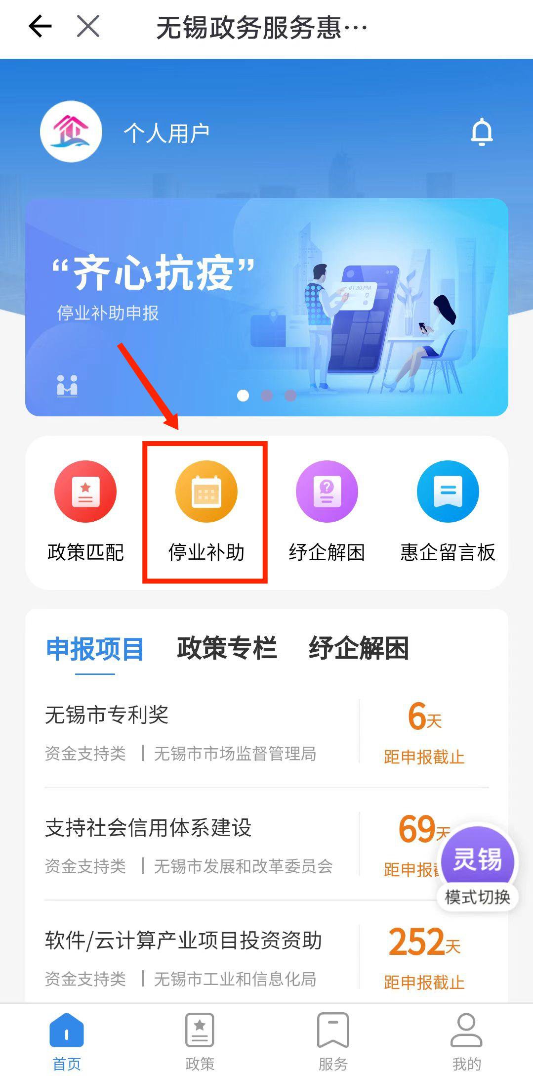 登录成功后,点击灵锡APP首页右侧的模式切换按钮,进入“惠企通”模式。