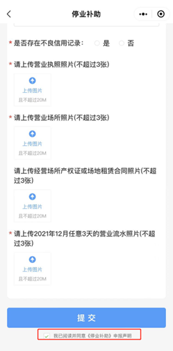 按“停业补助”申报页的内容完成申报信息填写,勾选底部同意《停业补助》申报申明选项,阅读确认后点击“提交”按钮完成申报。