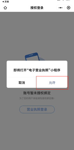点击“停业补助”申报详情页右侧上方的“申报”按钮,点击“电子营业执照登录”并跳转至“电子营业执照”小程序。