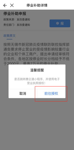 点击“惠企通”首页“停业补助“,进入“停业补助”申报详情页。