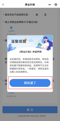 按“停业补助”申报页的内容完成申报信息填写,勾选底部同意《停业补助》申报申明选项,阅读确认后点击“提交”按钮完成申报。