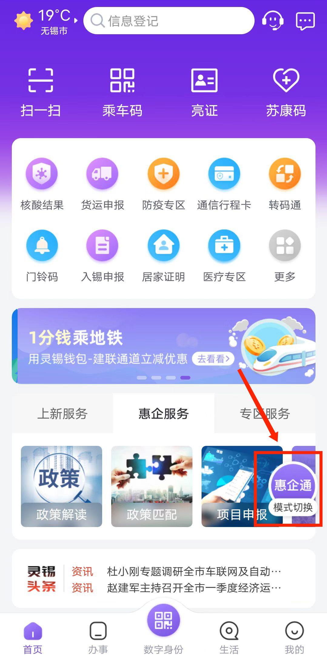 登录成功后,点击灵锡APP首页右侧的模式切换按钮,进入“惠企通”模式。