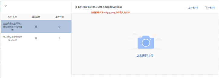 7.点击“材料上传”,其中“企业招用就业困难人员社会保险补贴申请表”为必选项。