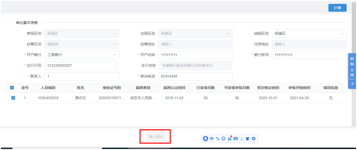 6.在补贴申请界面,系统将自动列出当月符合补贴享受条件的人员名单,用人单位勾选当月享受补贴人员,将补贴申请相关信息填写完整,点击“计算”,带“*”号为必填项。