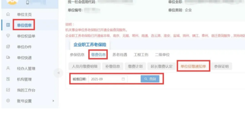 第二步:点击左侧“单位信息”,点击“缴费信息”-“单位征缴通知单”,选择日期,点击“查询”。