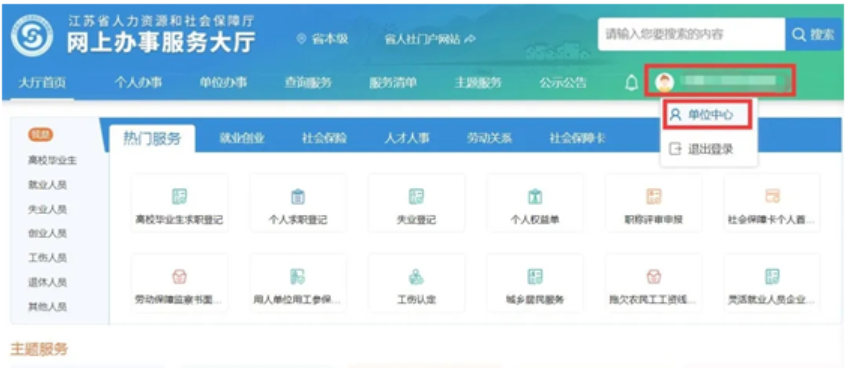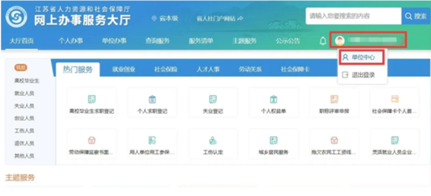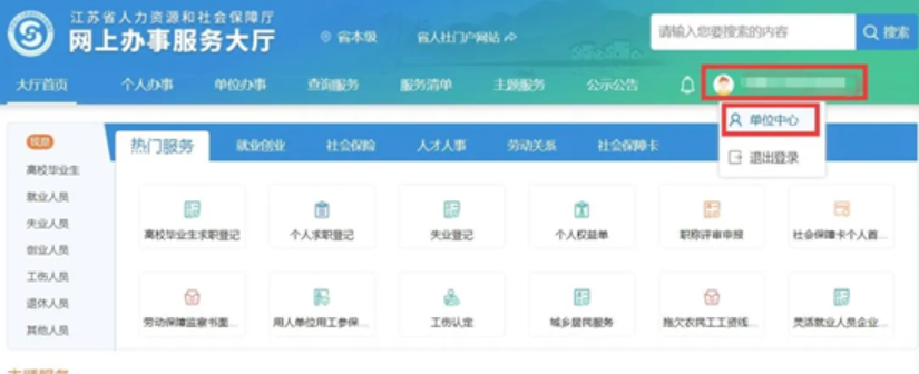 第一步:输入网址:https://rs.jshrss.jiangsu.gov.cn/进入江苏人社网上办事服务大厅,点击页面右上角“单位中心”。