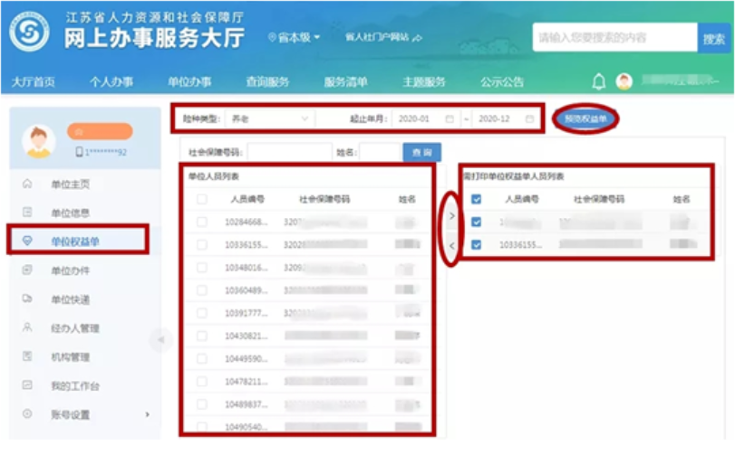第二步:点击左侧“单位权益单”,选择险种类型、起止年月等项目,添加人员,点击“预览权益单”。