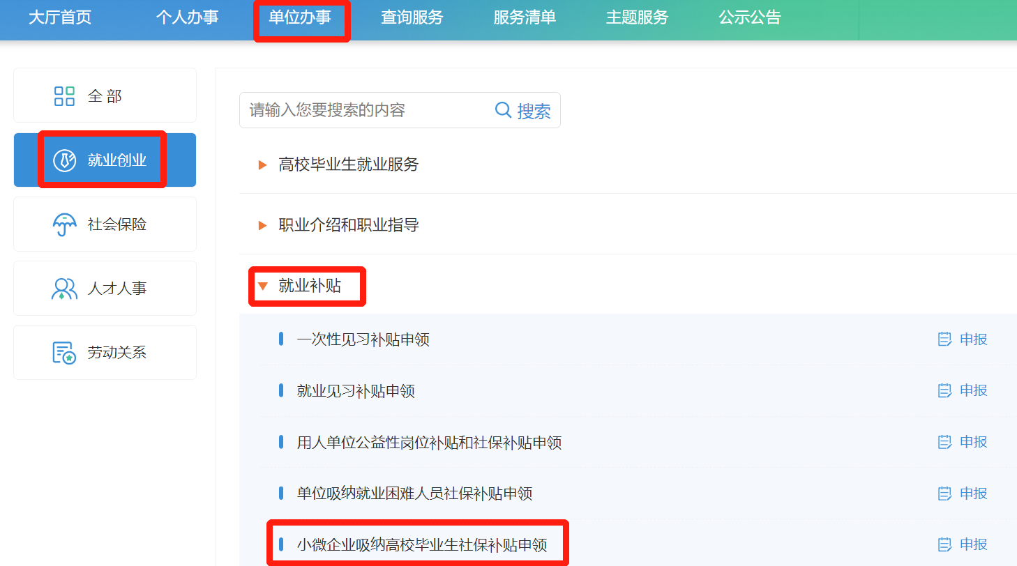 登陆江苏省人社网上办事服务大厅(https://rs.jshrss.jiangsu.gov.cn/index/),选择“无锡”市,依次点击“单位办事”—“就业创业 —“就业补贴”—“小微企业吸纳高校毕业生就业社保补贴”—“申报”
