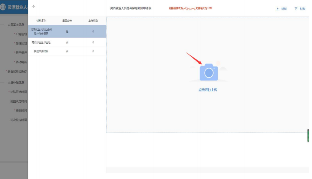 3. 点击右侧“材料列表”上传填写好的“灵活就业人员社会保险补贴申请表”和相关材料