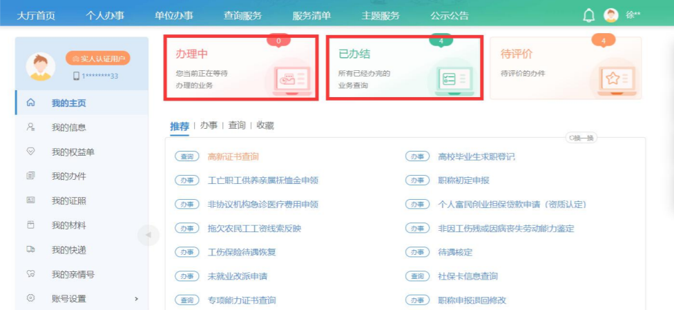5. 办理完成后可在“个人中心”中查看所办事项进度和通过情况