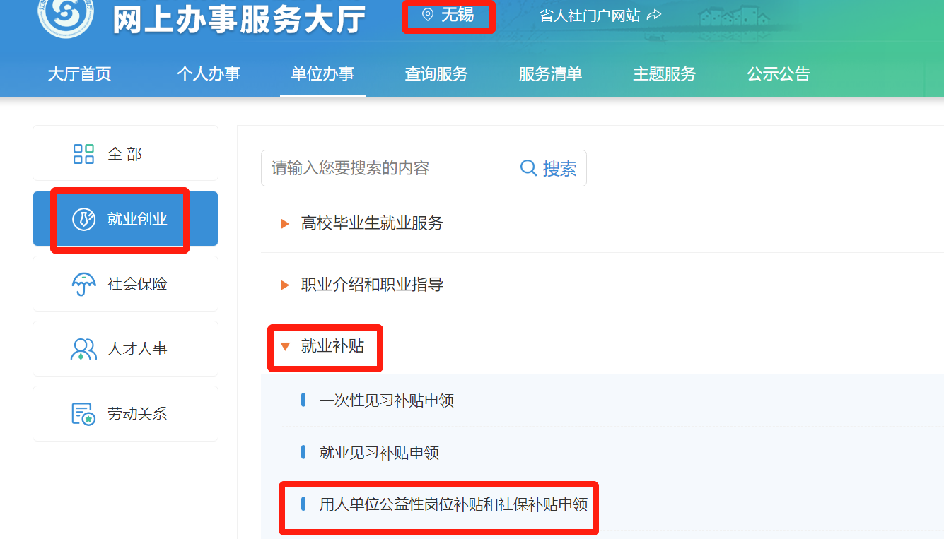 1.登陆江苏省人社网上办事服务大厅(https://rs.jshrss.jiangsu.gov.cn/index/),选择“无锡”市,依次点击“单位办事”—“就业创业 —“就业补贴”—“用人单位公益性岗位补贴和社保补贴申领”—“申报”
