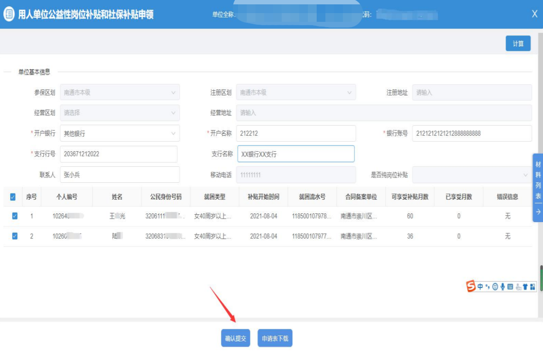 2.完善单位基本信息后,勾选需申请公益性岗位补贴的人员并点击右上角“计算”核验可享受补贴月数:下载并按要求填写“用人单位公益性岗位补贴和社保补贴申请表”