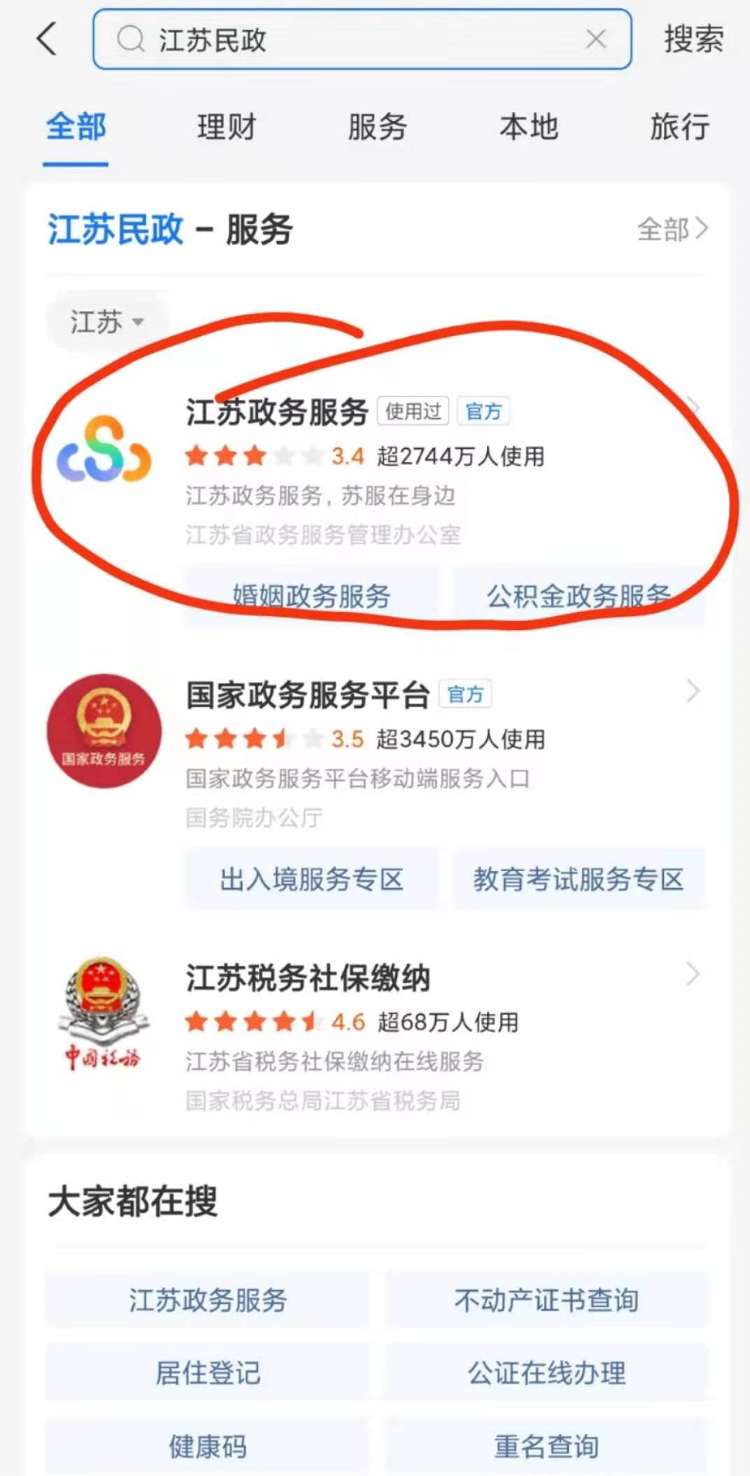(二)支付宝搜索中的“江苏政府服务”进入预约