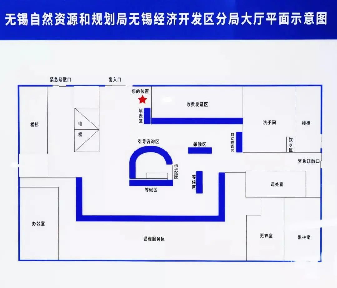 分为受理区、咨询区、休息等候区、自助填表区、网上帮办区、发证区和24小时自助办理区共七大功能区。配备排队叫号系统以及运行状态屏等各类信息屏;不动产自助终端一体机免费打印复印、饮水机、应急医药包、雨伞、老花眼镜等人性化便民设施和用具等便民设施。