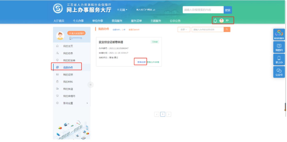 第三步:提交申请后,您可以进入页面右上方的个人中心,找到左方菜单栏中的“我的办件”,通过“就业创业证邮寄申请”中的“查看进度”,了解申请进度。