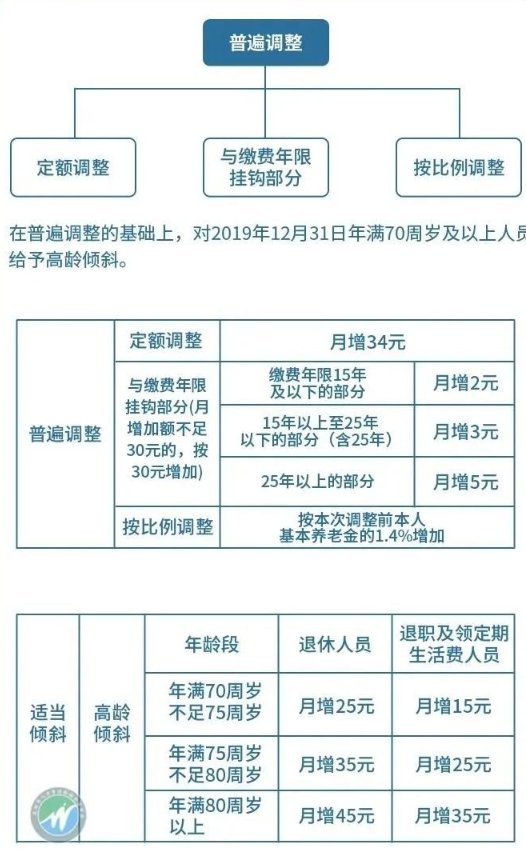 1. 2019年12月31日年满70周岁(年龄以办理退休手续时确定的出生年月为准,下同)不足75周岁、年满75周岁不足80周岁以及年满80周岁以上的退休人员,每人每月分别增发25元、35元和45元;2019年12月31日年满70周岁不足75周岁、年满75周岁不足80周岁以及年满80周岁以上的退职及领取定期生活费人员,每人每月分别增发15元、25元和35元。