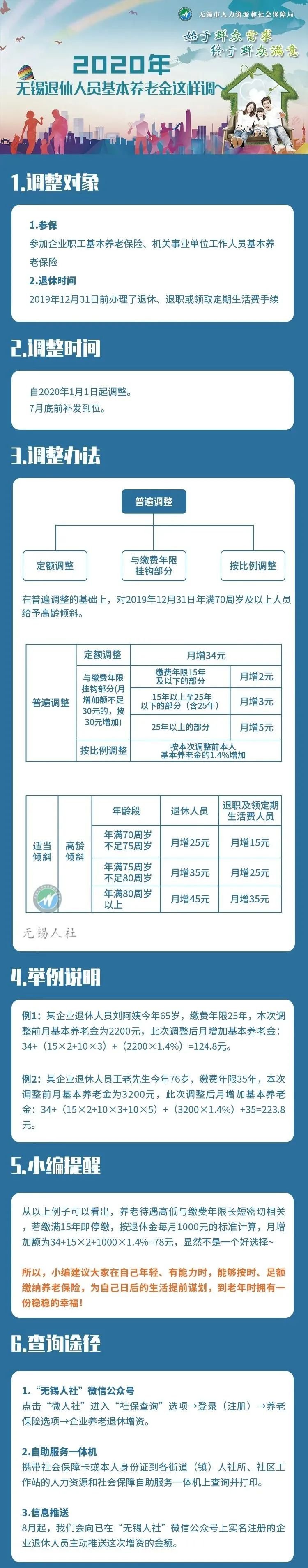 根据无锡人社8月1日官方微信报道,根据省人力资源社会保障厅、省财政厅《关于2020年调整退休人员基本养老金的通知》要求,无锡市市区退休人员的养老金自2020年1月1日起调整,增发部分已于7月底前补发到位。
