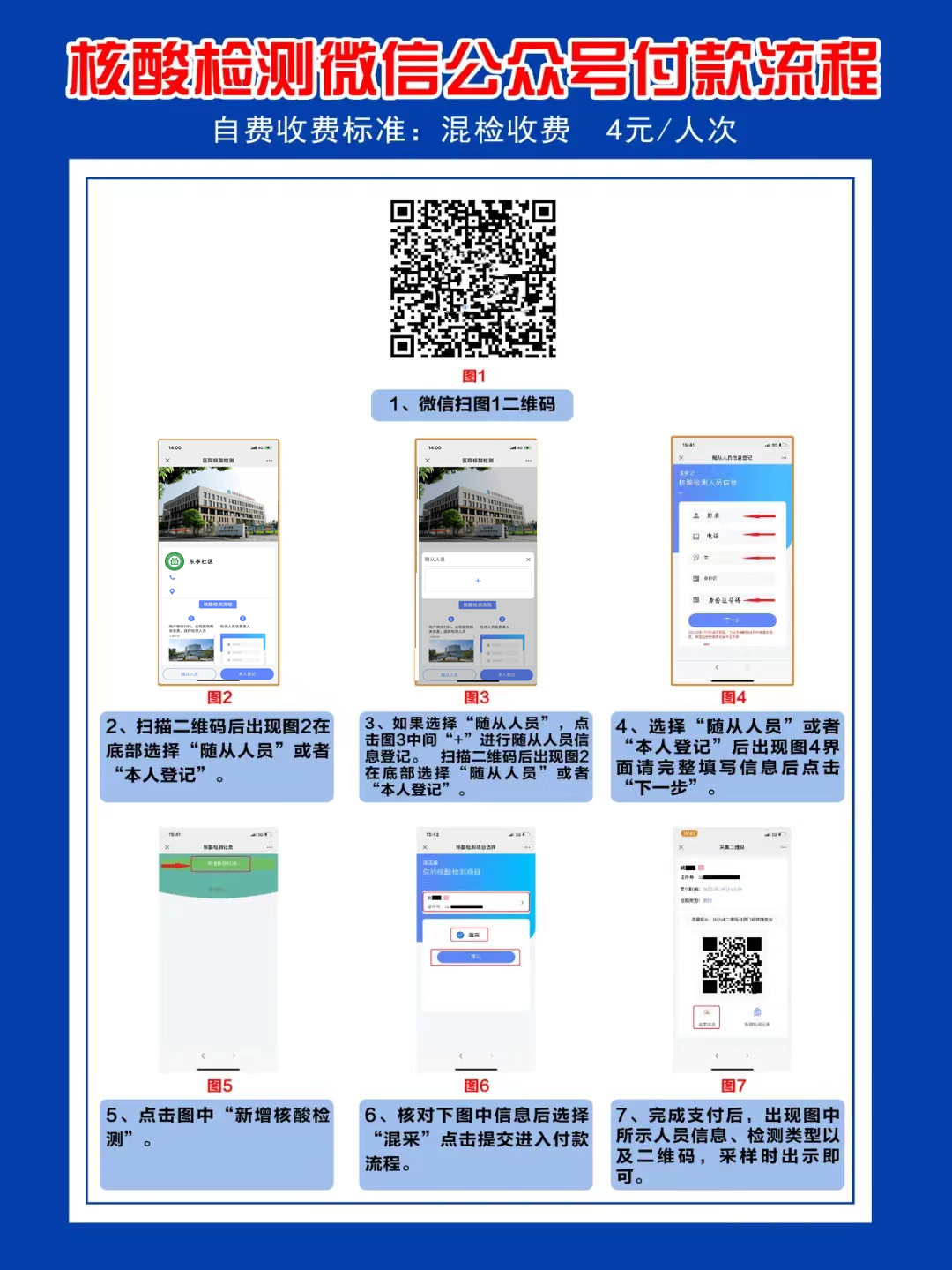 除应检尽检人员外,其他人员核酸检测需现场微信扫二维码,按照页面内的指示完成信息登记、费用支付等操作,并将支付后的凭据展示给现场工作人员。