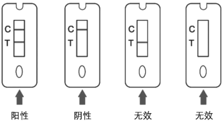 观察检测卡,无论“T”处是否显示条带,“C”处未显示出红色或紫色条带,则为无效结果,需重测。