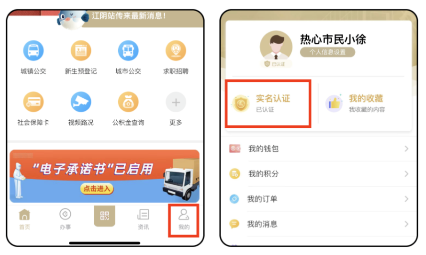 2、应检尽检人群必须在“最江阴”APP上进行实名认证”。打开APP-点击右下角【我的】-点击【实名认证】