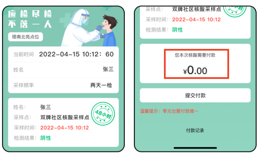 8、【应检尽检、愿检尽检界面】应检尽检人员:超过规定检测频率,则需付费检测。愿检尽检人员:扫码后,完成付费,即可检测。