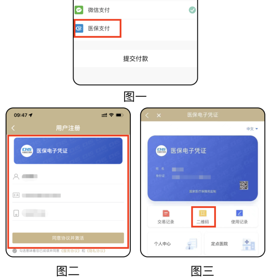 10、【医保付费界面】若该点位支持医保支付,则可在付款界面选择“医保支付”,并点击提交付款。若从未绑定医保凭证,可按图二提示进行绑定,若已跳出医保界面,则点击图三“二维码标识”,将二维码出示给工作人员,付费后即可检测。