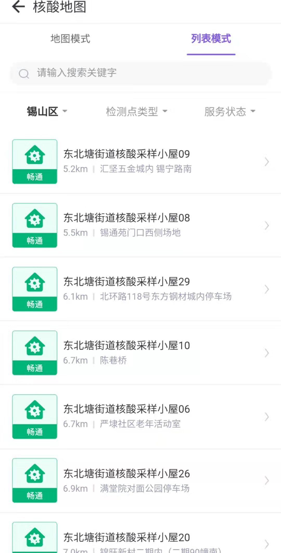 ③进入后点击“核酸检测地图”,使用列表模式查看,将地址切换为自己想要采样的地区,如“锡山区”、“梁溪区”,即可查看详细的核酸检测地址。点击小屋列表即可查看该小屋开放时间