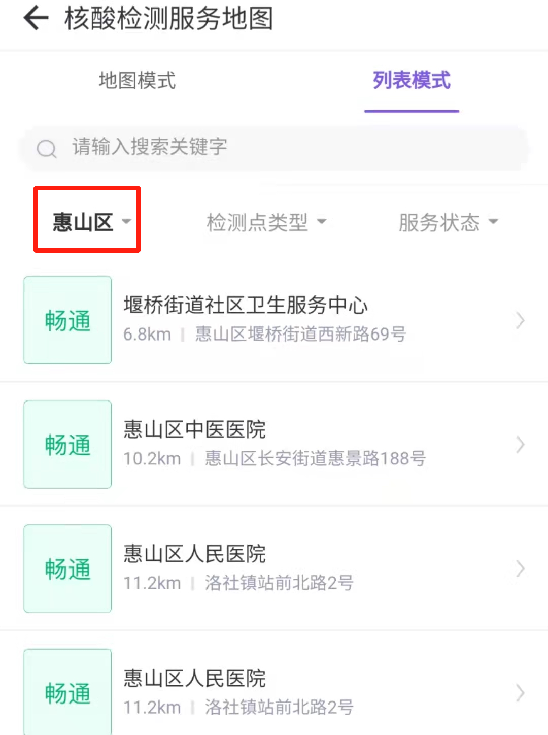③进入后点击“核酸检测地图”,选择“惠山区”,使用“列表模式”查看,即可查看详细的核酸检测地址