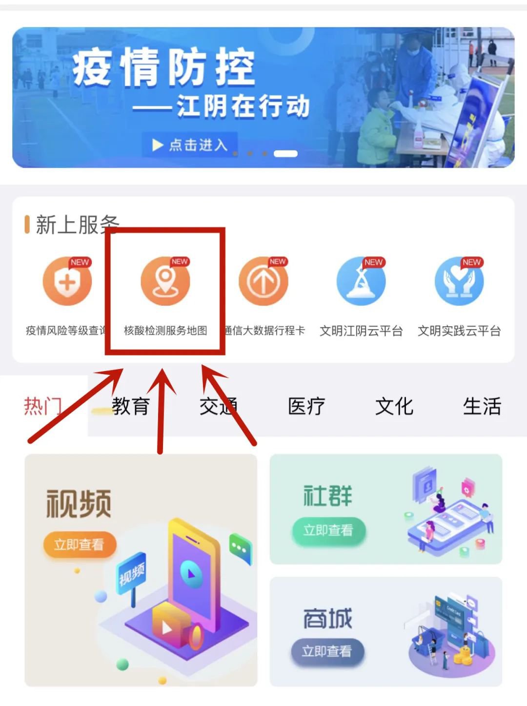 ①扫描二维码下载“最江阴”APP,点击进入首页“核酸检测服务地图”。