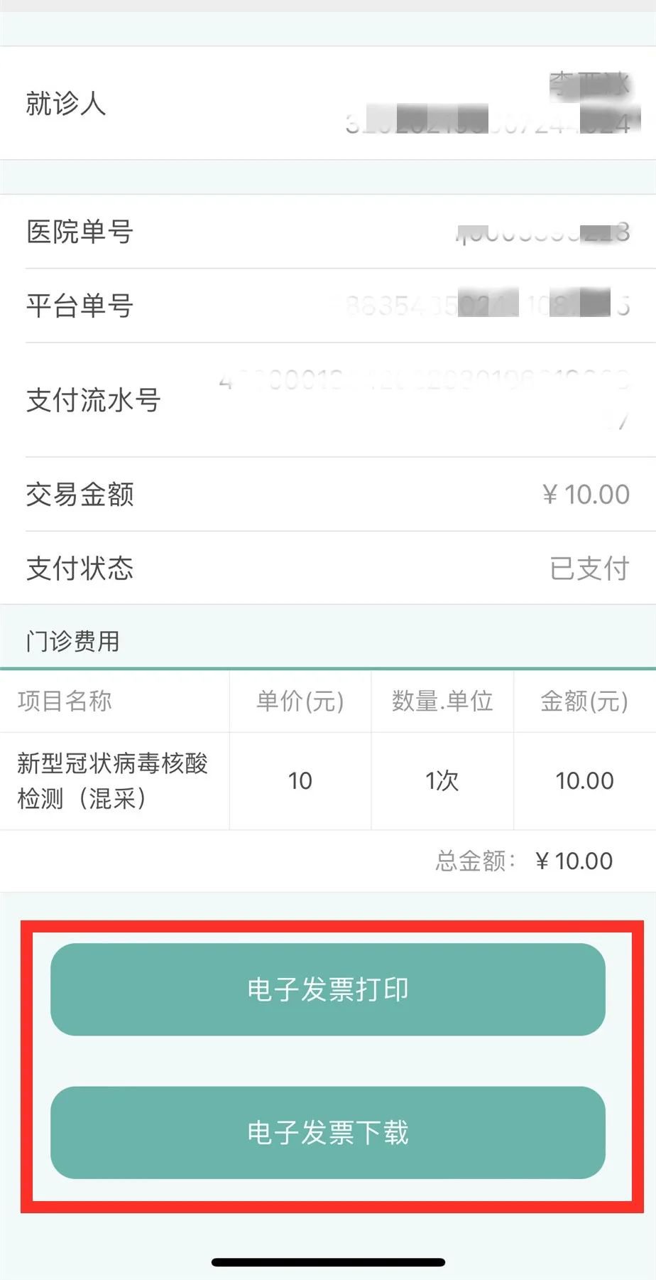 缴费成功后凭就诊码至九院采样处采样(可下载电子发票)