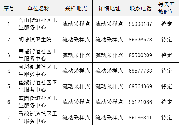 增设4个固定采样点,分别为马山园区采样点、山水城院所采样点、蠡园开发区采样点、胡埭工业园采样点,主要服务于周边科研院所、规上企业、商区等人群的采样。如果景区开放,将根据需要增设景区采样点。